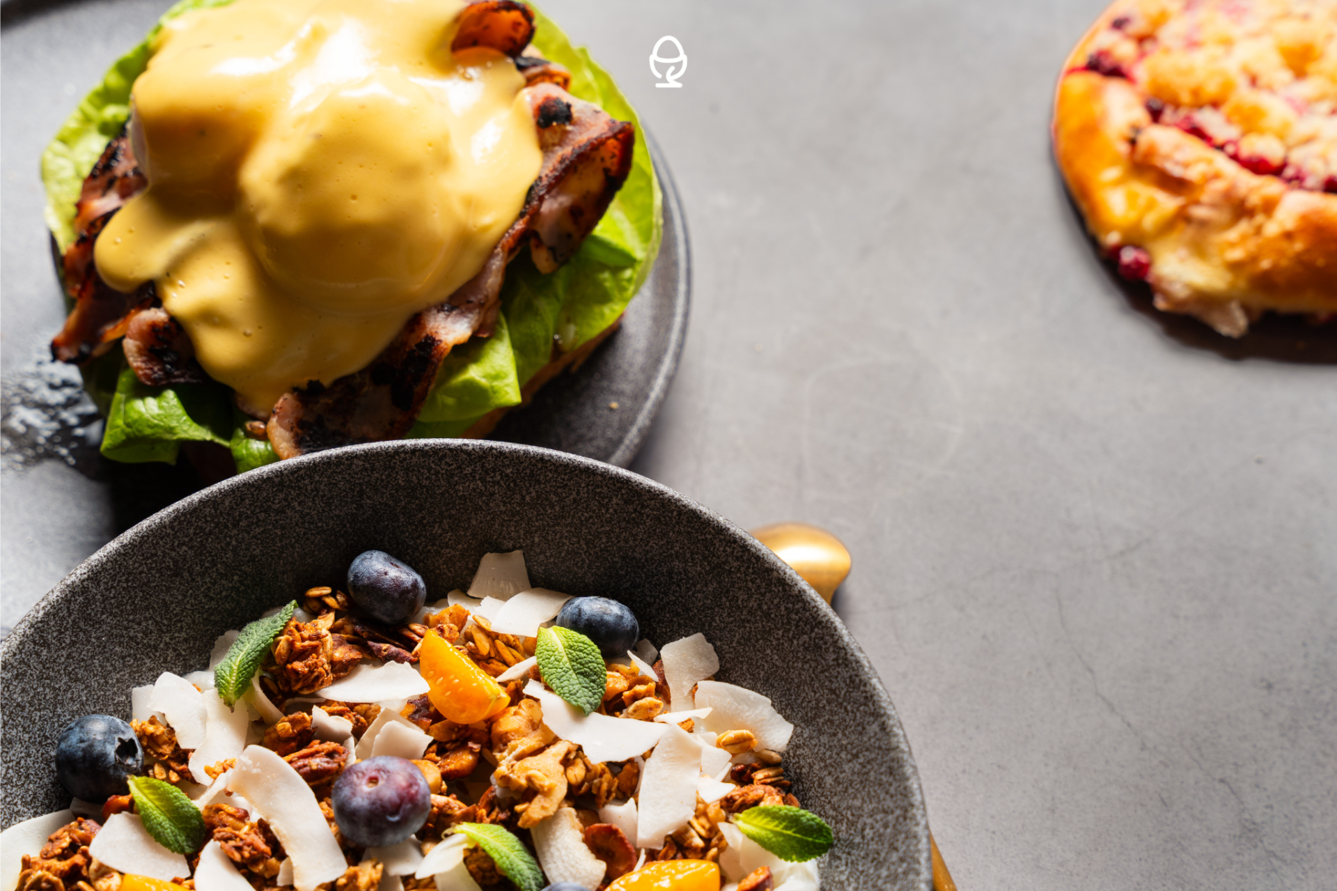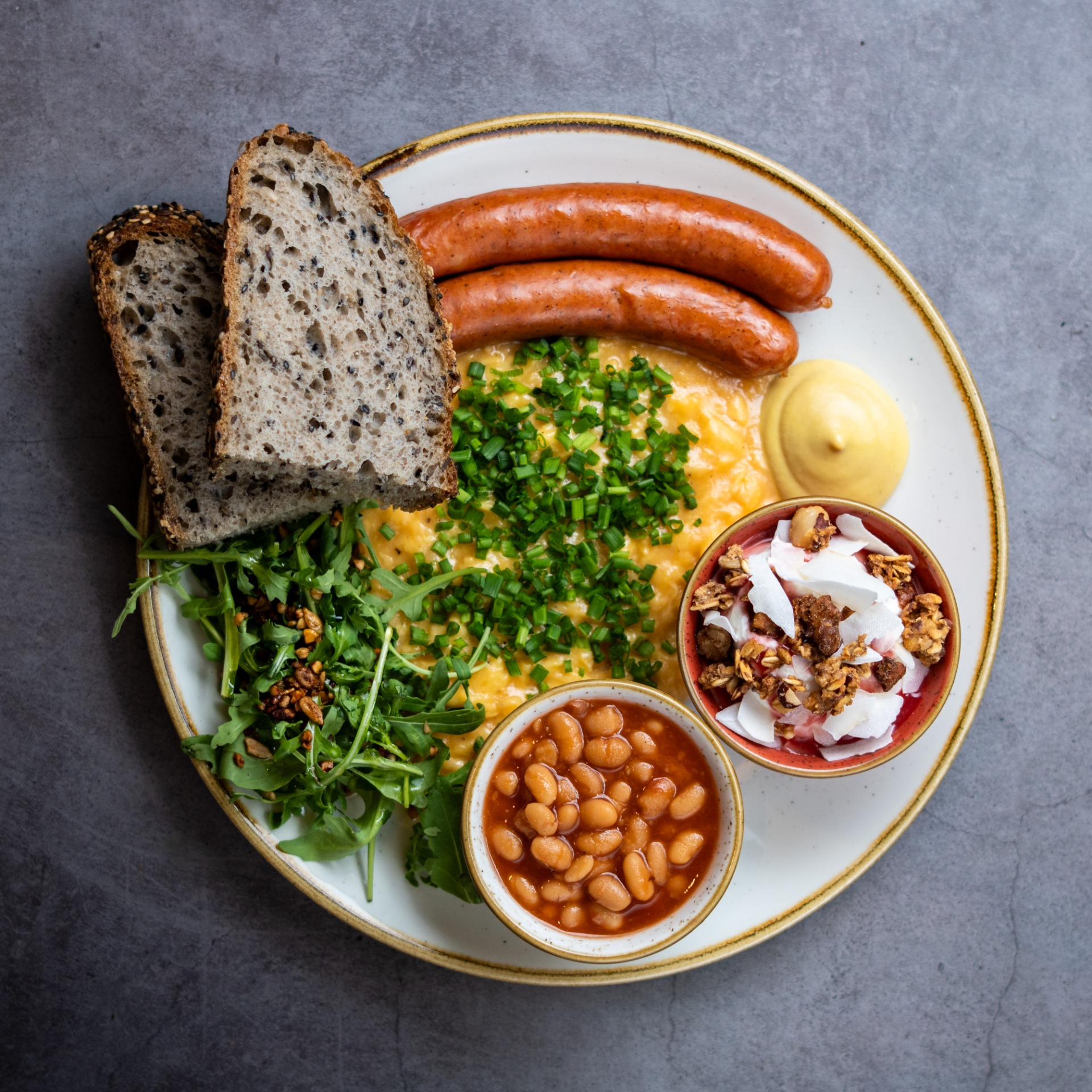 Míchaná vejce s pažitkou, farmářské párečky, hořčice, rukolový salát s pohankovou granolou a olivovým olejem, krajíc Zrna, jogurt s ovocným pyré, granola karamel a kokos